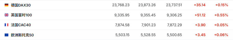 2. 截至发稿,德国DAX指数涨0.15%,英国富时100指数涨0.55%,法国CAC40指数涨0.05%,欧洲斯托克50指数涨0.06%。